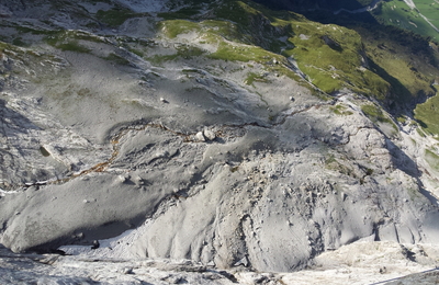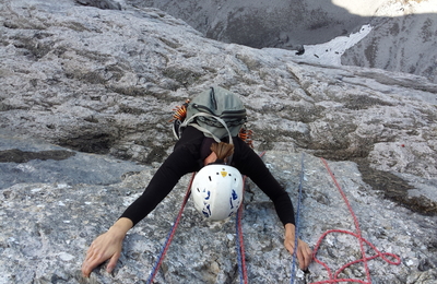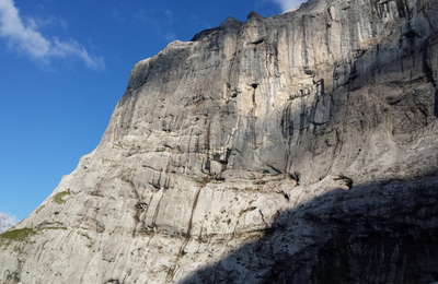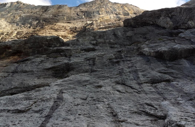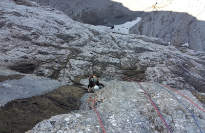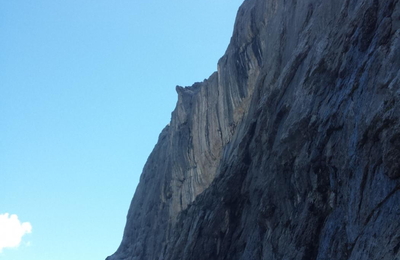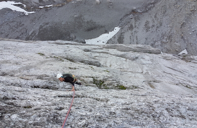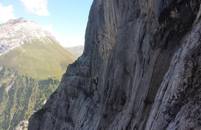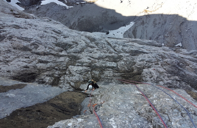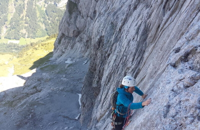 Pia und ich hatten Ausgang und so konnten wir uns ein Wellnesprogramm nach unserem Geschmack zusammenstellen. Nach einem Zustieg von 2h standen wir um 11.30 Uhr am Wandfuss. Vorgenommen hatten wir uns die Route 'Lochblick'. Die Tour wurde 2010 von meinem Kletterspezi Sämi Speck eingebohrt. Mit 7a+ gehört sie zu den einfacheren Routen in der Titlis Nordwand. Trotzdem sollte man die Kletterei nicht unterschätzen. Die Route zählt mit ihren 500 m zu den längsten in der Wand. Die Absicherung ist gut, überall, wo es schwierig und nötig ist, stecken Haken. Die Kletterei ist im ersten Drittel plattig an Löchern und erlaubt schnelles Vorankommen. Im 2. Drittel steilt die Wand auf und es folgen die Schlüsselstellen, die nie sehr anhaltend sind. Im obersten Drittel gehen die Schwierigkeiten zurück und man erreicht den Pfeilerkopf durch gestuftes Gelände neben dem Felsentor. Der Fels in der Route ist nicht überall sehr fest und verlangt überlegtes Klettern. Zudem müssen immer wieder kleine Schuttbänder überquert werden, wo vor allem beim Abseilen aufgepasst werden muss.